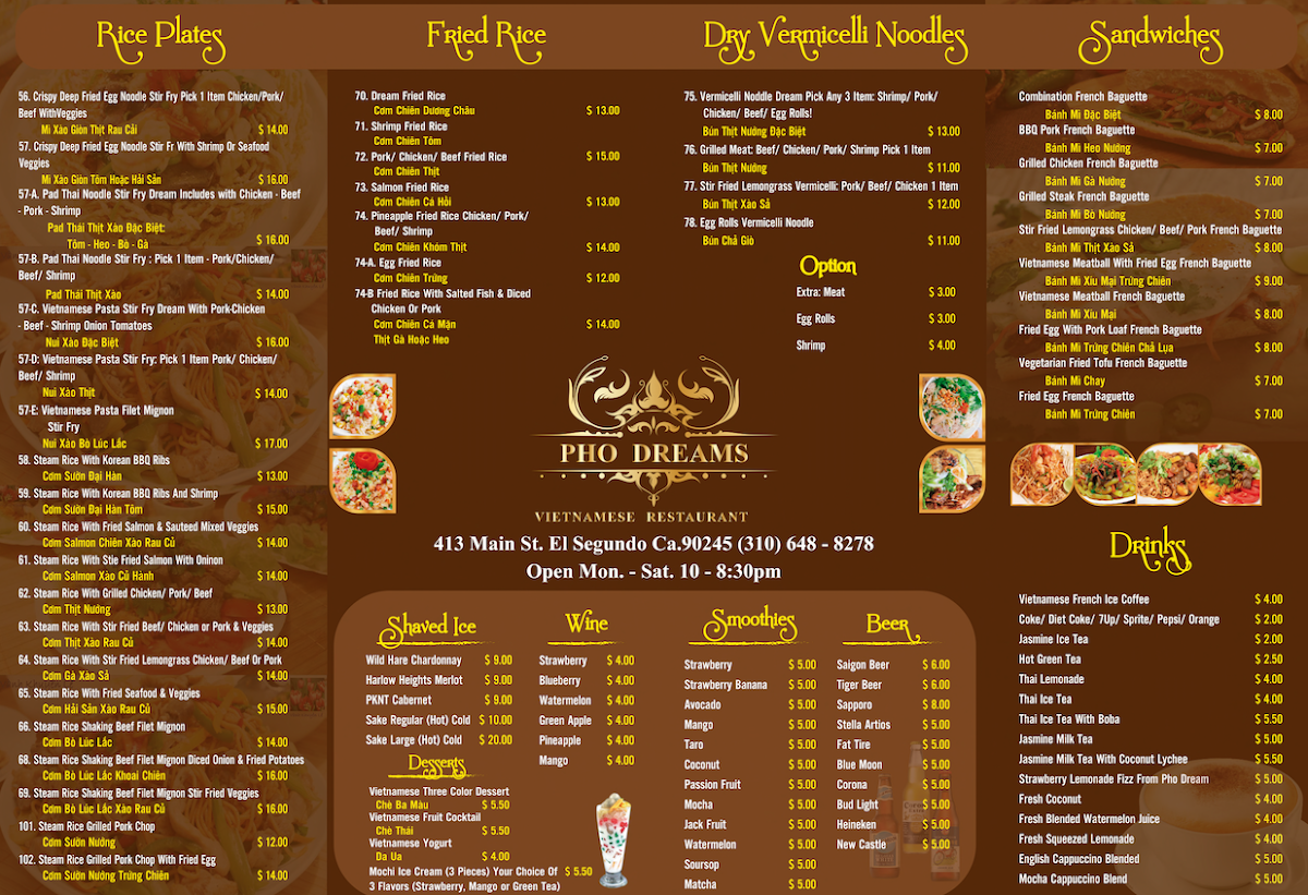 Welcome to Pho Dreams, a vibrant Vietnamese restaurant located at 413 Main St, El Segundo, CA. This culinary gem serves up an exquisite selection of traditional Vietnamese fare, with an emphasis on fresh and bold flavors. The menu features an array of pho options, including the much-loved Extra Rare Beef and Meatball variations, accompanied by perfectly cooked noodles and fragrant broth. For those seeking a delightful crunch, the Spring Rolls are a must-try, praised for their freshness and the perfect hint of mint.